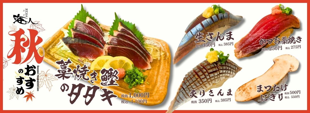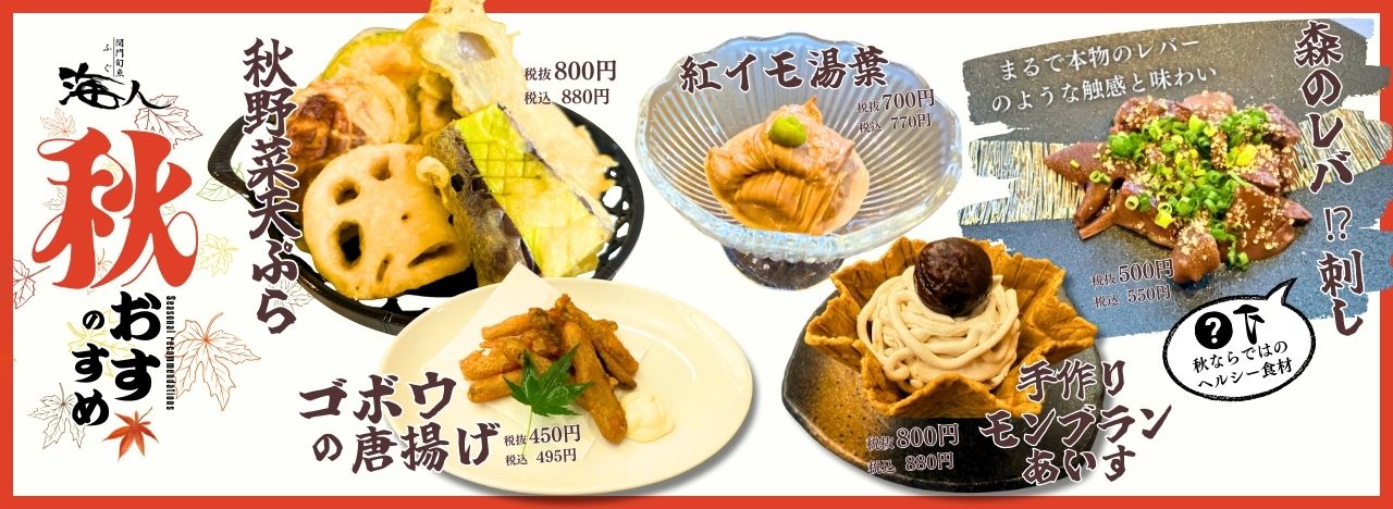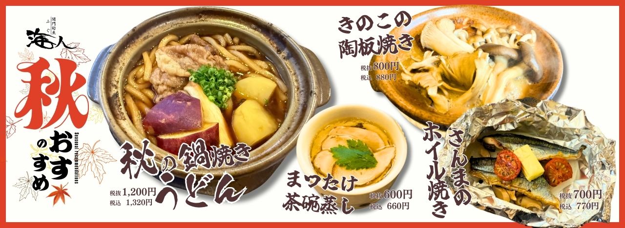👉 期間限定 🍂 秋の味覚フェア開催中! 旬の味わいを、ぜひ海人でお楽しみください😊